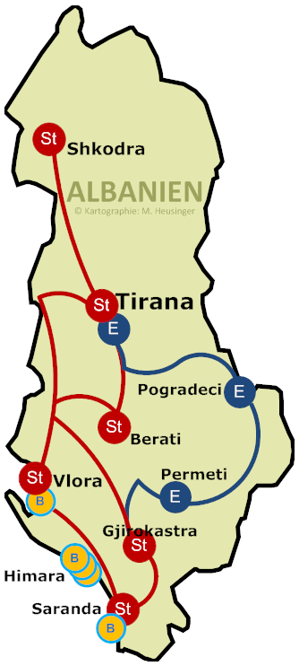 Auf dieser 10-tägigen Standard-Rundfahrt (siehe Karte: rot) lernt Ihr die herrlichen Gebirgs- und Küstenlandschaften, sowie die kulturhistorischen Höhepunkte des westlichen Albaniens als Selbstfahrer im Mietwagen oder im eigenen Fahrzeug kennen. Dazu gehören natürlich die UNESCO Stätten Butrint, Gjirokastra und Berat, aber auch weniger bekannte Orte wie die Illyrerfestung Rozafa (Shkodra), oder die archäologischen Parks Apolonia und Bylis. Mit der Erweiterungsoption in den Osten (siehe Karte: blau), unter anderem zum Ohridsee, und einigen Badetagen an der albanischen Riviera am ionischen Meer (siehe Karte: gelb) lässt sich bequem ein individueller 2-wöchiger Urlaub (oder länger) zusammenstellen.